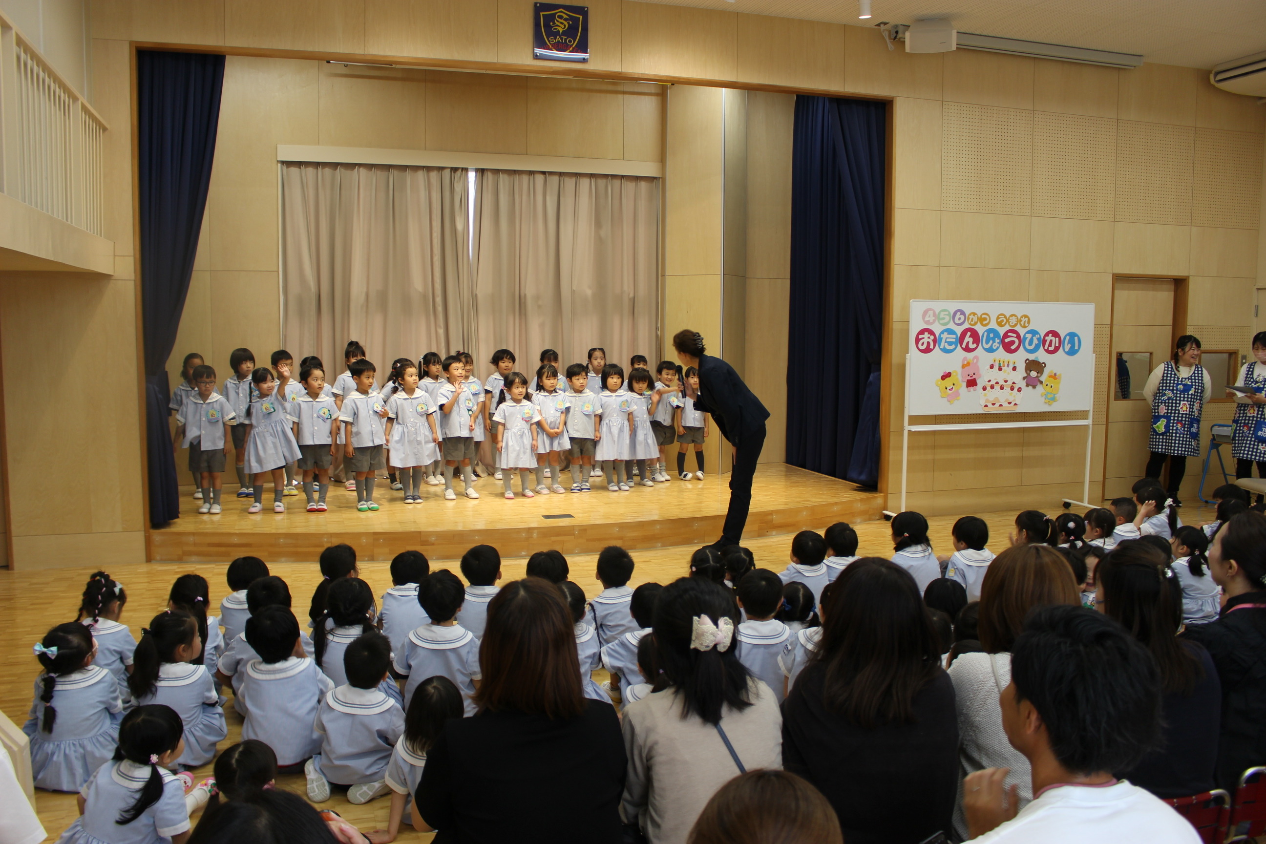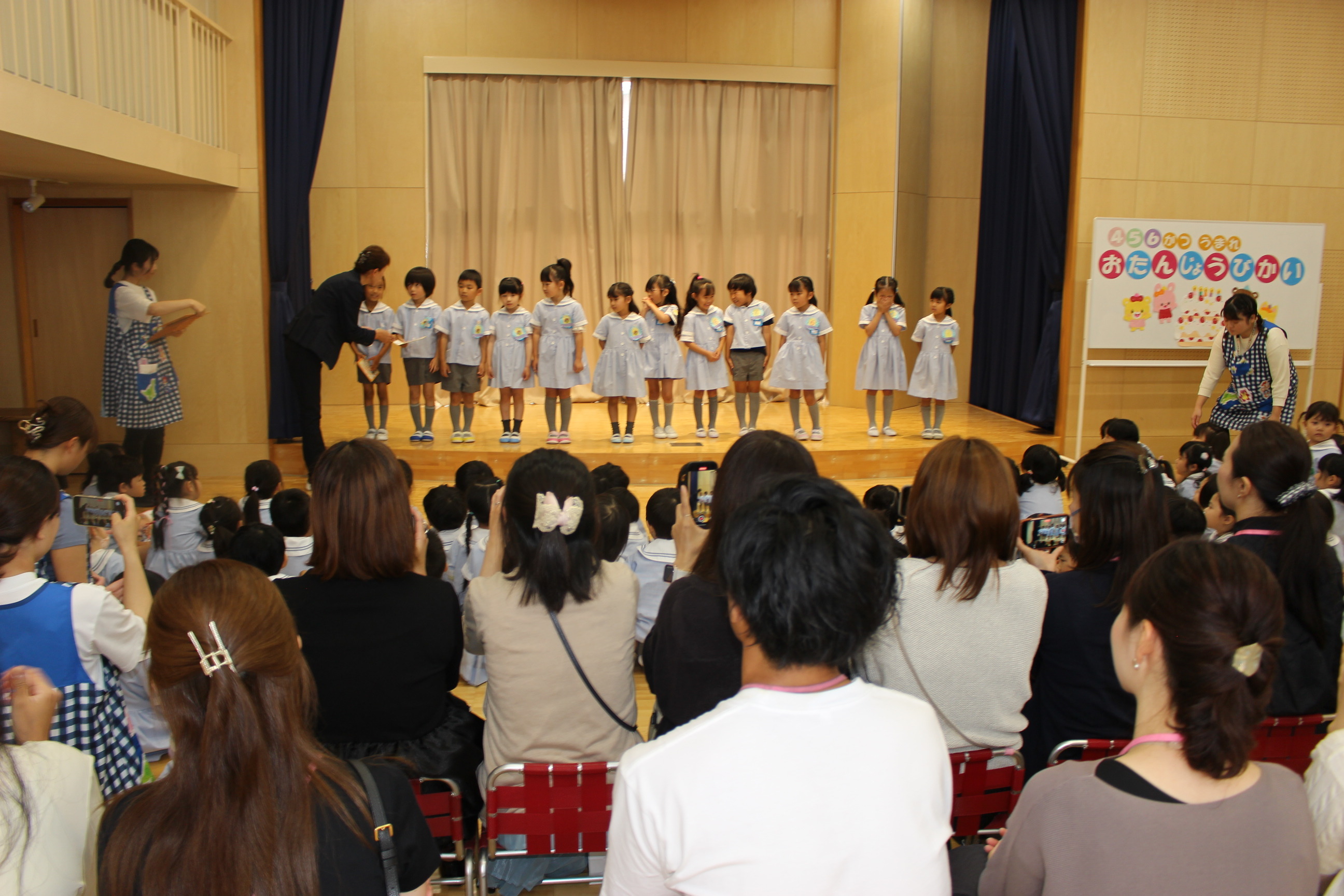お遊戯室でお誕生日者の保護者の方を招待し、4・5・6月生まれのお誕生日会を行いました。